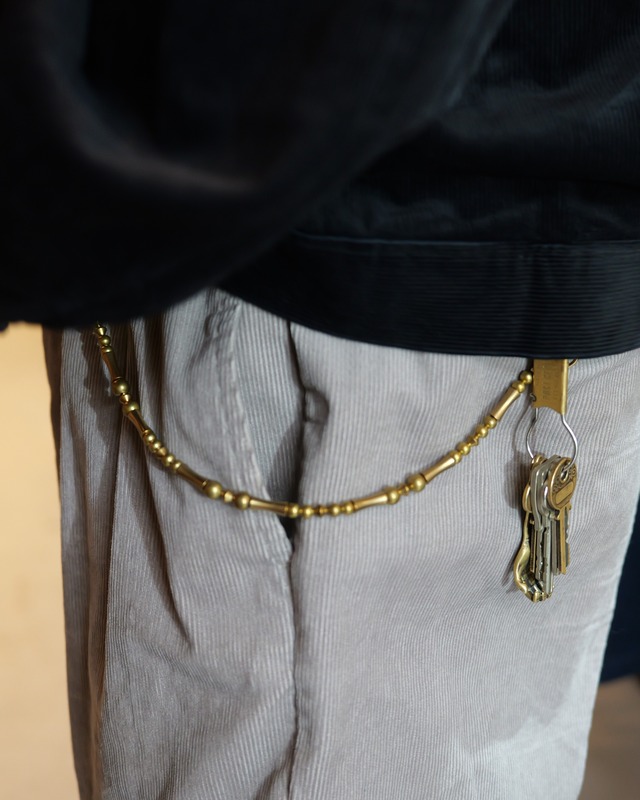 日本の最南端、沖縄発のブランド『 Lieve 』 ひとつひとつハンドメイドで丁寧に作られるアクセサリーブランド。 ありそうでなかなか無いデザインの真鍮製のウォレットチェーン 無骨というよりスマートに、 シンプルながらも、主張し過ぎず、でも存在感あふれるデザイン、、 アメカジはもちろん、モードなファッションに取り入れても面白い、、 人と被りたくない、個性的なモノが欲しい、 ソコの貴方、、、 そんな方に、是非お手に取ってもらいたい商品です。 ビーズ部分がALL真鍮なので、経年変化も楽しんで頂けます。 サイズ:約40cm (留め具から留め具まで) 素材:ビーズ部分 真鍮 留め具部分 ステンレス 価格:¥12,000 (+TAX)