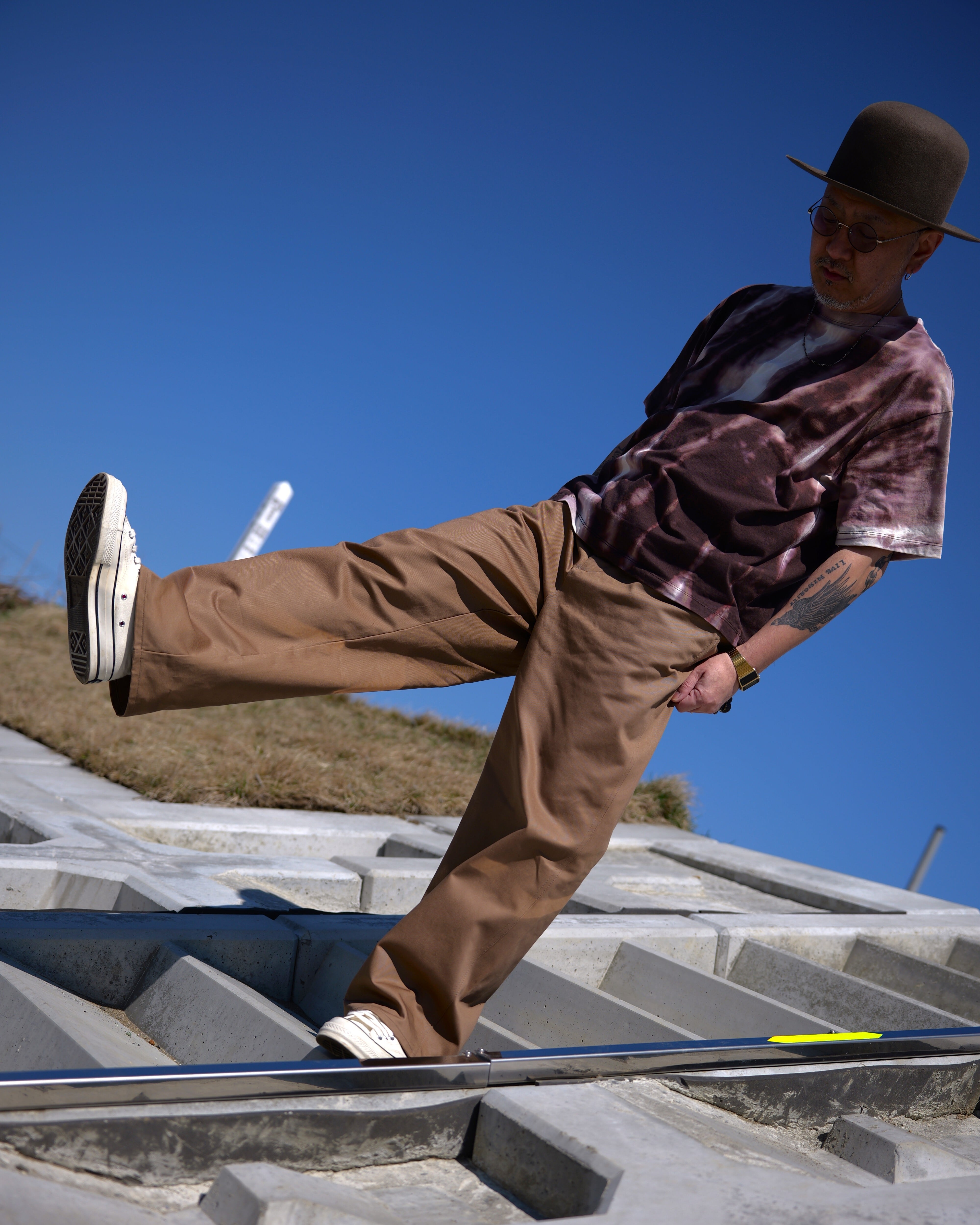 深めに設定された股上、ゆとりを持たせたワタリで太めのストレートシルエットに仕上げています。
