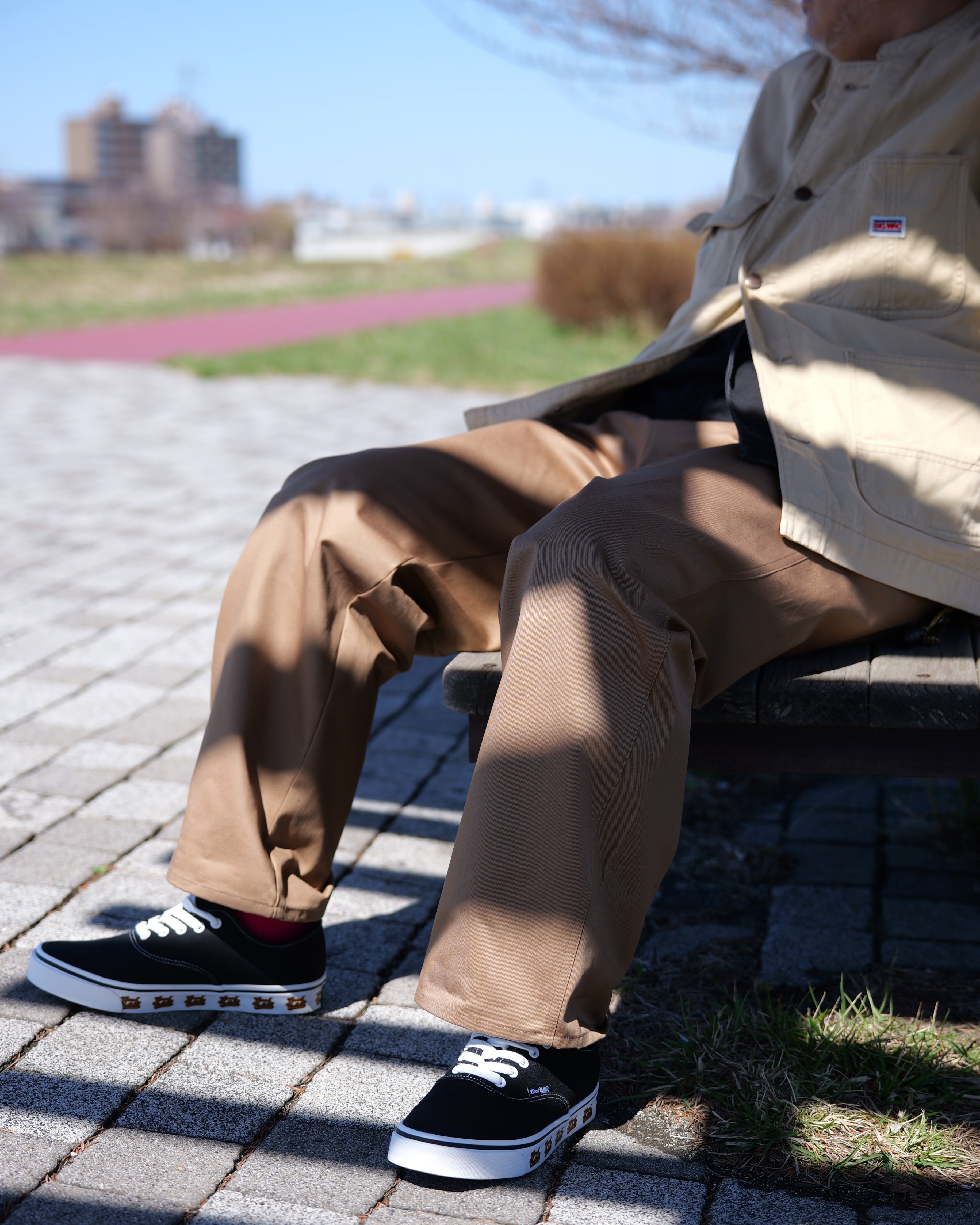 ワンサイズ上をギュっと締めての着用もおすすめです。生地には高密度に織り上げた国産チノクロスを採用。